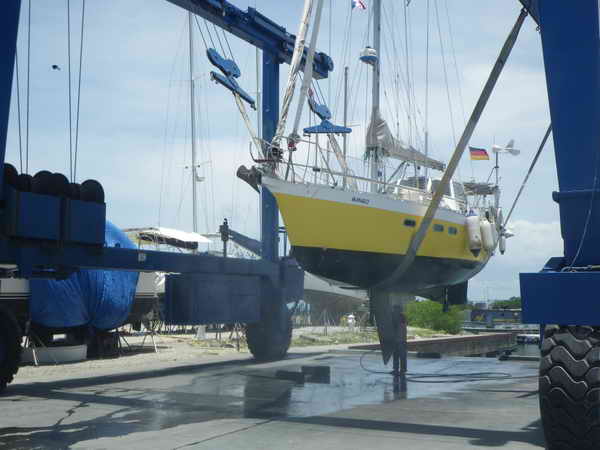 Gleich darauf am Mittag um 12:00 Uhr ging es dann für Mango aus dem Wasser. Es ist immer ein spannender Moment, wenn das Schiff mit dem Travellift aus dem Wasser gehoben wird. Es muss ordentlich bedacht werden, wo die zwei Gurte unterm Schiff durch können, damit es richtig hängt und keine Borddurchlässe beschädigt werden.