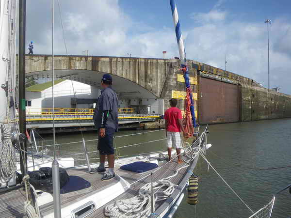 Mit uns warteten der amerikanisch-brasilianische Katamaran IIWII und die australische 54-Fuß Hallberg-Rassy Walkabout. Wir alle sollten um 14:00 Uhr auf den Flats bereit sein, unsere Advisors zu übernehmen. Als kein Advisor kam, erfuhren wir über Funk, dass die Abfahrt sich auf 15:00 Uhr verschiebt. Zu der Zeit kam dann auch einen Lotsenboot, das brachte aber nur zwei Advisors für die anderen Boote. Unser Advisor kam erst 15 Minuten später mit einem anderen Lotsenboot - sehr effizient! Die Folge für uns war, dass der Advisor uns ziemlich antrieb hinter den anderen Booten zur Gatunschleuse zu kommen, obwohl wir das kleinste und langsamste der drei Boote waren. Wir preschten mit 7 Knoten dank Rückenwind durch die lange Zufahrt dahin. Von der Einfahrt durch die großen Molen, die die Reede von Colon schützen, bis zur ersten Schleuse sind es nämlich noch fast 5,5 sm. Unser Motor hatte unter uns noch nie so arbeiten müssen. Vor den Schleusen bildeten wir dann ein Päckchen. Walkabout kam als größtes Schiff in die Mitte und wir gingen Steuerbord bei ihnen längsseits.